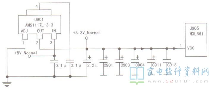 上电,测得这几个引脚电压均约为1.3V,未见明显异常。接下来测量②脚(SDA)、2脚(SCL)电压,均为0.5V,明显异常(正常电压约为3V)。本机主芯片总线外挂元件除U39外,还有U15(MSH6110A),USB分配芯片U49(GL852G),高频头硅调芯片U905( MXL66L)。图像正常,说明CPU工作正常,则内核供电芯片U14.U15也应该没问题;插入U盘,能识别,说明U49也没问题。对于U39和U905的判断,采用断开的方法:拆下电阻R364.R382,测量主芯片的总线电压仍为0.5V ,说明U905有问题。上电,测得U905①脚3.3V供电电压为0V;断电,测得该脚对地呈现短路状态。此路供电由低压差供电块U901(AMS1117L-3.3 )提供,如图2所示。