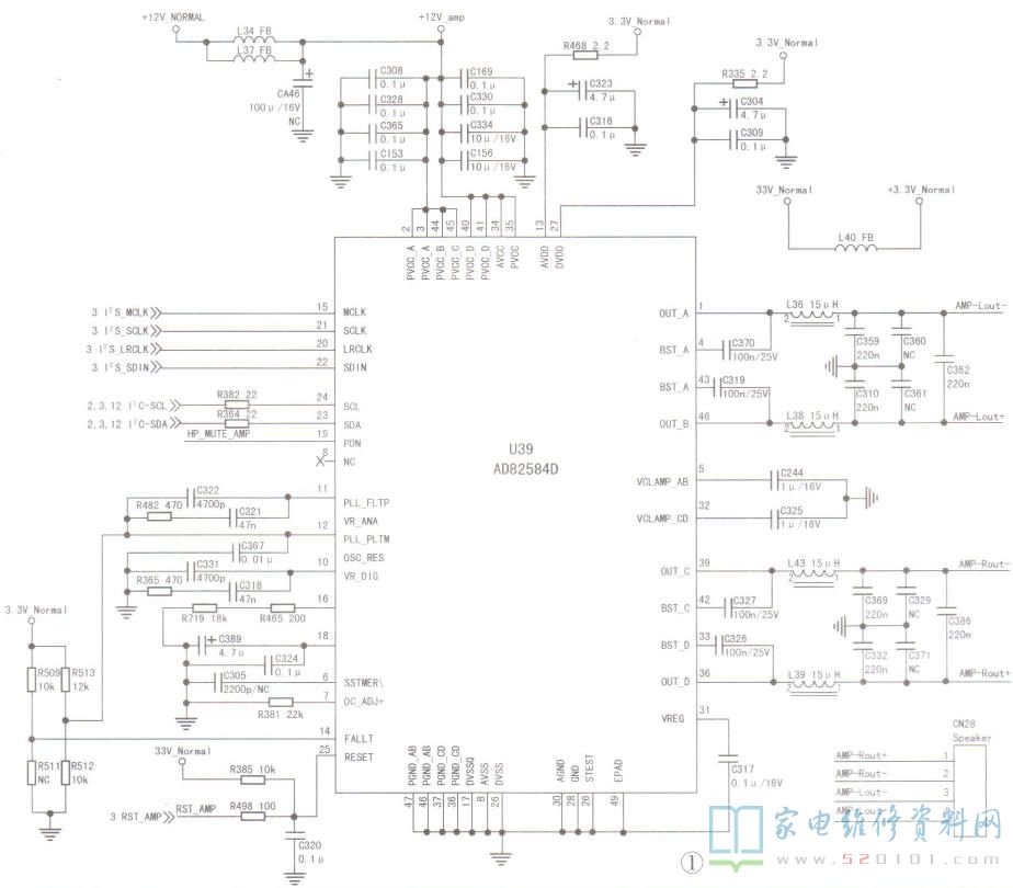 接修一台海尔LS55AL88G31液晶电视,故障表现为开机后图像正常,在各种信号源状态下均无伴音。本机主芯片是Mstar638搭载阿里云智能系统。首先怀疑软件有问题,进入菜单一系统一关于一恢复出厂,执行完毕后故障依旧,说明硬件存在故障。本机伴音功放芯片采用LQFP封装的AD82584D(U39),共48个引脚,如图1所示。