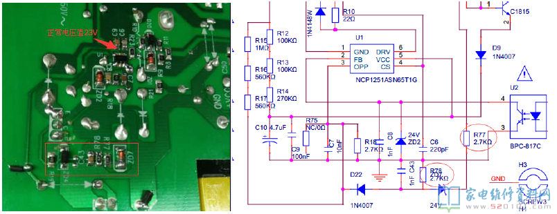 一台创维40G6A液晶电视(8A22机芯),故障表现为电源板老化自动关机/带不起负载。通电试板,电源板(L3N021-00)正常开机,在老化1小时后,热机无输出。先排除保护电路的问题,测得Q1的电压正常值320V,发现5 脚VCC 输入只有5V,正常值是23V, 怀疑是U1(1251)问题更换后还是热机无输出。根据电路图,查出U1 输入脚VCC 线路上 R77/R78/ZD7 等热机状态性能不良,代换3元件后,老化1天,正常。
