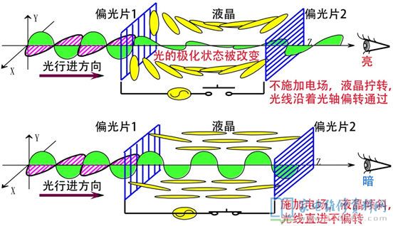 通过电场改变液晶的排列状态,从而控制光穿透液晶的多少,进而控制红、绿、蓝三色光的亮暗程度(即实现亮度控制)。