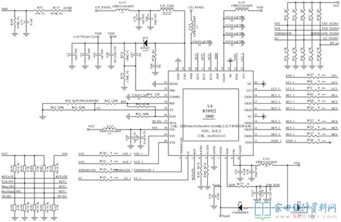 对于“花屏”故障,首先确认主板送到TCON板的LVDS信号为正常,然后依次检查TCON板上的VIN、VCC、VGL、DCOUT、RESETB、AVDD、VGH等供电或信号输出到相应电路是否正常,接着检查电平移相(转换)电路是否正常,最后考虑屏体驱动电路是否损坏。
