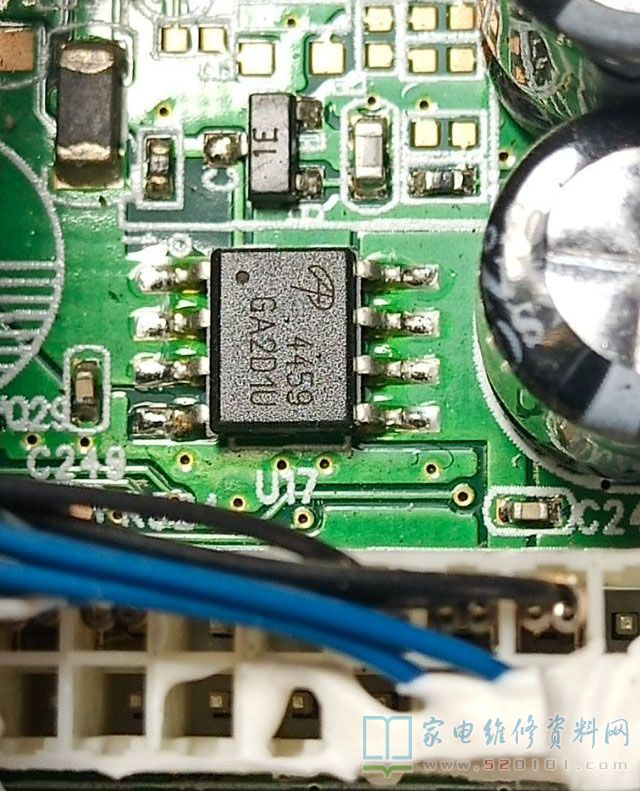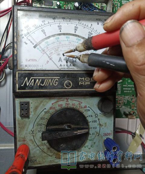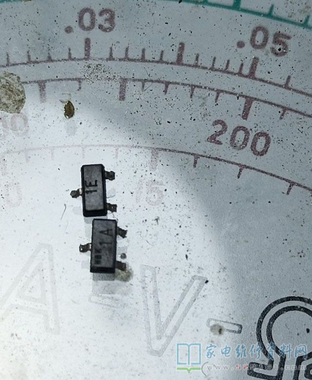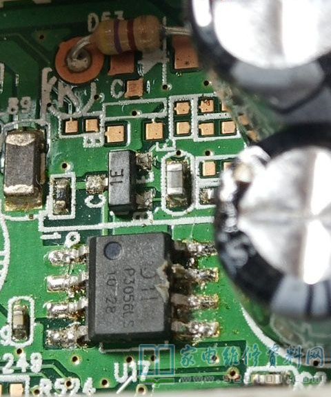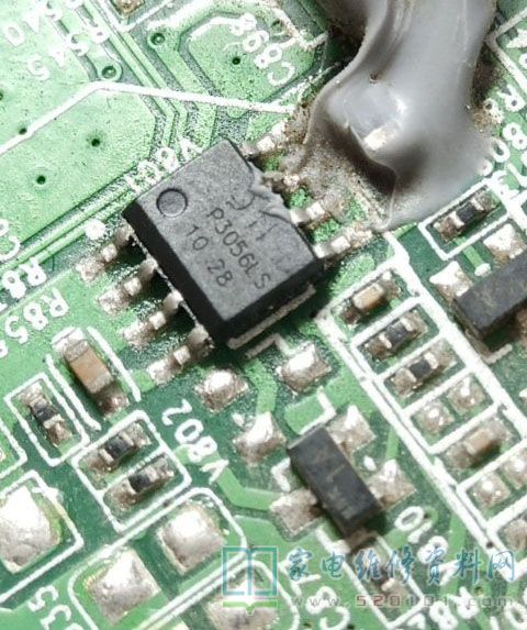 接修一台海尔L40F6液晶电视(家电下乡机型),故障表现为暗灰屏有伴音,光栅很暗的那种,屏好像是灰的,太暗了,看不清,伴音正常,此故障一般在屏电路。拆机检修,先测量屏供电电压12V,只有1V。屏供电芯片是4495,在旧板上焊下芯片P3056LS八脚芯片,网上查的资料说这个是2脚MOS管,原来是“同名不同姓”而已,不管了先换上再说,但还是无输出,测量3脚电压有10V,而且开关机时此脚电压变化不明显,短接4459芯片的输入和输出有700mA的电流,而且图像出现,3脚控制的一个三极管型号是丝印1E。用旧板上的丝印1A代换后,开机画面正常了,测量5678脚有12V输出了。丝印1e三极管在冷态下测量阻值大,而正常的丝印1A不管怎么测量阻值为15-20Ω之间,说明此机故障元凶就是这个小小的丝印三极管1E了。