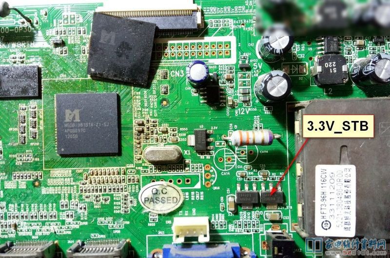 +5V_STB经U2,1117稳压输出+3.3V_STB,断电,测1117中间输出脚对地电阻,接近于零,割断至主芯片的铜箔,电阻恢复正常。通电,+3.3V_STB也恢复正常,悲剧,主芯片挂了。将结果通报给客户,给了换板和换芯片的价格,客户选了换芯片(时间长一点)。主芯片型号:MSD6I981BTA-Z1-SJ,三天后到货,上焊台,冷却后上机,开机音乐响起,屏幕点亮,一切正常。