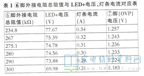 分析检修:在确认灯条插座接触正常的情况下,故障原因多为过压保护电路误动作,解决方法有以下两种:(1)适当降低灯珠电流,间接降低OVP取样电压。U800的⑥脚外接两只并联的灯条电流设置电阻R809、R813,阻值均为470k,则并联后的总阻值为235k,此时灯条电流为0.34A。改变⑥脚外接电阻的总阻值,即可改变灯条电流,实测数据见表1。