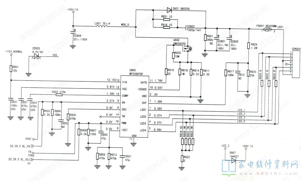 接修一台海尔LE32A31型液晶彩电(RTK2969机芯)的背光恒流控制芯片采用MP3398TGF(U800),如图1所示。二次开机后,开关电源输出约50V直流电压,通过蓄能电感L801加到Q802的漏极(D);13脚输入12V直流电压,⑨脚( EN)得到点灯开启电压,16脚(PWM)得到调光电压,U800进入工作状态,11脚(GATE)输出PWM方波脉冲控制Q802工作在开关状态。L801 在Q802饱和期间蓄能。当Q802截止时,L801中的输出电压与输入的50V直流电压叠加,经D801(SB5200,肖特基二极管)、EC801、EC802滤波后输出77.67V直流电压,加到屏内灯串的正极。