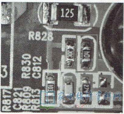 实修时,可先拆下R809和R813,然后再装上一只270k(274)的电阻,如图4所示。这时测得输出电压为75.39V,灯条电流约为0.31A,降低了约0.03A。由于该机屏幕中间没有安装灯条,是靠反光纸反射一部分光线到中间,所以灯条电流不能降低得太多,一般降至0.25A~0.36A即可。否则,图像亮度不均。