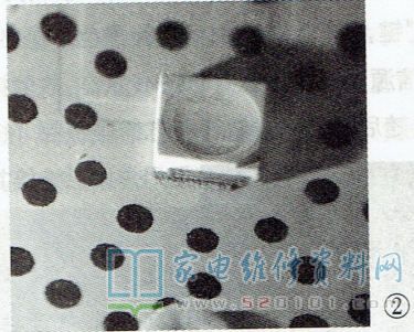 分析检修:背光一闪就灭,说明屏内灯珠没有完全断路,故障原因可能是部分灯珠正向压降增大,或者回路中存在接触电阻,导致背光供电升高,触发过压保护。开机后监测背光插座两端的电压,发现该电压升到90多伏后又迅速降到50V。经查,灯条中一颗灯珠接触不良,如图2所示。取下聚光罩,抹上一点BGA焊膏在灯珠引脚处,然后将热风枪设置为260°C,补焊即可。另外,在安装聚光罩时,一定要对准灯芯,尽量 与灯芯贴合,不然会出现光圈现象。需要说明的是,有些灯珠用点灯测灯仪能点亮,亮度也基本正常,但上机后一闪就灭,电路进入过压保护状态。测试灯珠,不是电流越大越好。在实际检修中,可用指针万用表Rx10k挡,黑表笔接灯珠正极,红表笔接灯珠负极,看灯珠是否被点亮,若能点亮,再对比其他灯珠的亮度,只要亮度一样,就没问题;如果灯珠不发光或发光很暗,则说明这只灯珠正向特性变差,需更换。3V或6V供电的灯珠均可用这个方法来测试。