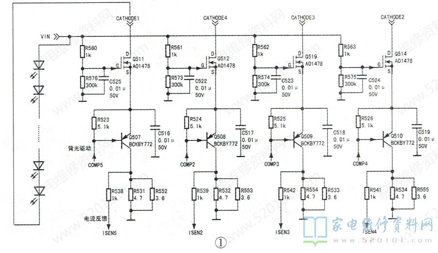 该机背光控制芯片采用OZ9908B(IC501),当32脚(VIN)得电、31脚(ENA )获得高电平,23脚(UVIS)电压高于3V时,芯片启动工作。28脚(ISW)检测升压MOS管S端的电压是否正常,22脚(COMP)分别输出驱动脉冲,驱动灯条负端的PNP型三极管Q507~Q510,如图1所示。