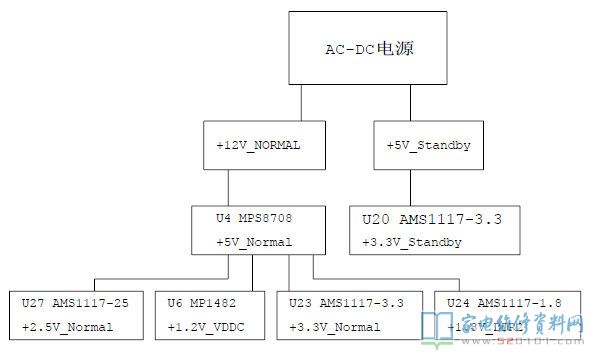 接修一台创维42K03HR液晶电视,故障表现为通电绿灯亮,其它都无反应,大略的测了板各供电正常,供电开启电压1.3V正常,无背光开启信号,按键板电压0.2V,拆下按键板,电压不变,果断的重下了程序,还是一样故障。拆下主板,上维修台细修,只接5V供电,测各待机电压,正常,按键电压3.3V,应该没问题,问题应在12V供电及其电路,装上主板,仔细测12V下面各供电,发现U24内存供电1.8V变成了1.2V,(很多主板上有1.2V的供电,所以刚开始量时,没看图,也没看型号以为是正常的)换1117-1.8,开机正常。
