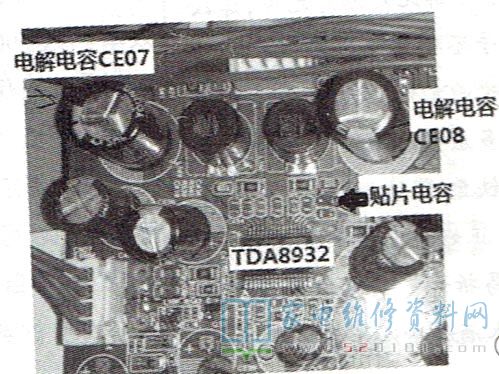 接修一台海尔L32RIB型液晶彩电,开机后图像正常,无伴音。根据故障现象,判定故障部位在伴音电路。该机伴音功放IC型号为TDA8932,如图1所示。断电,用手摸IC表面,烫手,这明显不对。查询资料得知,无声音是该机型通病,其故障原因一是TDA8932本身损坏,二是功放块外围贴片电容或电解电容CE07、CE08(均为470uF/35V )击穿。先测TDA8932的②脚供电为24V,正常;右声道输出端20脚电压为0V,正常值应为12V。用指针万用表RX100挡测量IC周围元件的电阻值,发现IC右上一只贴片电容正反向电阻均为0Ω。拆下该贴片电容再测,两焊盘间仍短路。顺着此线路检查,发现电解电容CE08失容,无电容充放电现象,将其换新后故障排除。