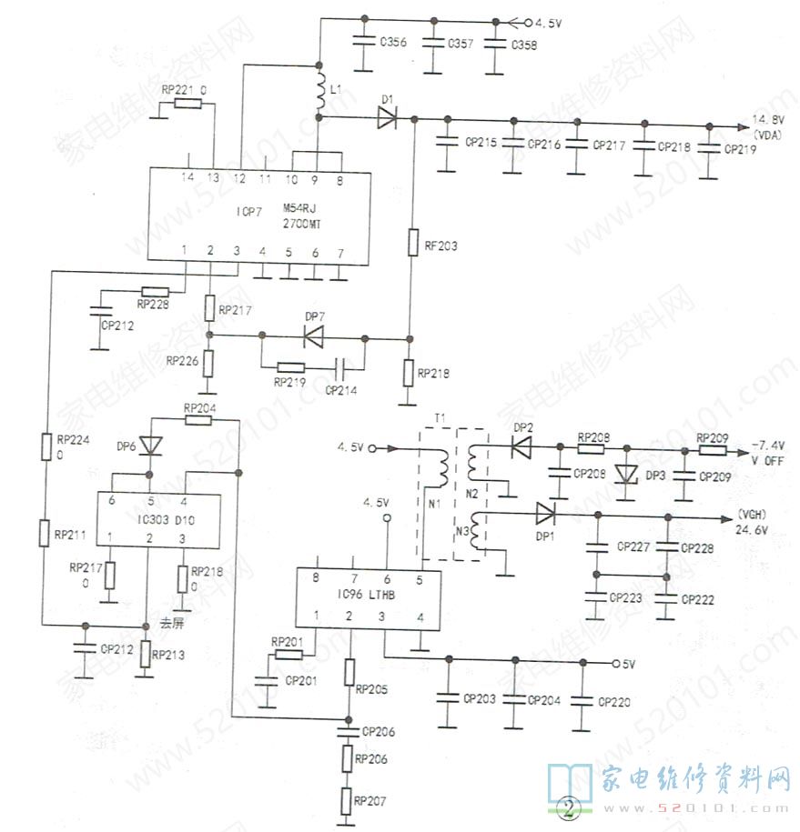 测得它们的输入均为4.5V(说明都是由上屏电压供电),ICP1输出的电压为3.19V,其余三只的输出电压均为2.47V。分析认为,ICP1输出电压为3.19V, 应是逻辑上的3.3V供电,用示波器测其纹波不大,说明3.3V供电正常。另三只的输出电压应是2.5V供电,测其纹波都不大,这说明2.5V供电也正常。接下来检测逻辑板上的VGH.VGL.VDA电压,由于板上只有一处标有“V OFF"字样(应该是VGL端),找不到VGH、VDA标注,因此只能照实物画出相关电路,如图2所示。