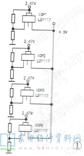 接修一台海尔L32V6-A8K型液晶彩电,故障表现为开机后有伴音、无屏显、无图像,满屏竖彩条。通电,仔细观察该机后发现,竖条的颜色、宽度、位置有变化,因此可以排除屏的故障,而逻辑板损坏的可能性较大。该机逻辑板的型号为320W2C4LV1.4,配三星屏,屏的型号为LTA320W2-L103。该机逻辑板的上屏电压为5V(由主板提供),实测为4.5V,且用示波器测纹波不大,判断上屏电压正常。含心 接下来检查逻辑板上的DC-DC转换电路。板上有四只LD1117,位号分别为ICP1、ICP2、ICP3、ICP5,如图1所示。