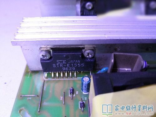 接修一块从同行那里拿过来的这块电源板,他说换了2个35V/1000UF鼓包电容,只有5V,没有12V 24V;我上电检测5V很稳,断电检查12V输出正反向电阻都小,取下整流管和滤波电容,用1K档检测没漏电和软击穿,装好整流管在路测正常,焊上滤波电容再测又短路了,代换掉在路测不再短路(这两个元件同行都拆下来查过),上电依然没12V 24V,找到该机电源板图纸,检查STR-E1555的15脚无工作电压,看图纸该电压从副电源输出,由待机电路控制Q5的导通输出到STE-E1555的15脚,果断短接待机接口到5V,12V24V有了。