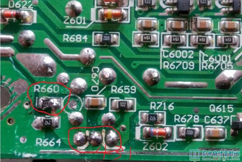 在路数字万能表测R664,R660分别为2.4k和20多K,R660偏大,焊下R660测阻值达几兆欧。R664和R660中点应为基准电压2.5v,电源输出端是5v,所以R664和R660阻值应相等。把R660换上2.4k电阻,再测待机输出5v正常,机子恢复好开机试机,一切正常。