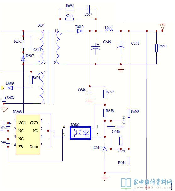 此机电源板号5800-plcd26-01,待机5v电压稳压电路如图。测比较电压端电压为0v,分析稳压电路可知,基准电压分压电阻R660阻值变大或是开路的可能性比较大。