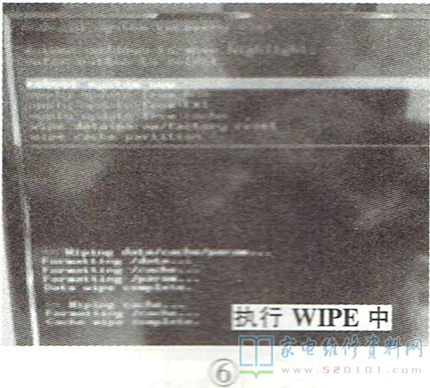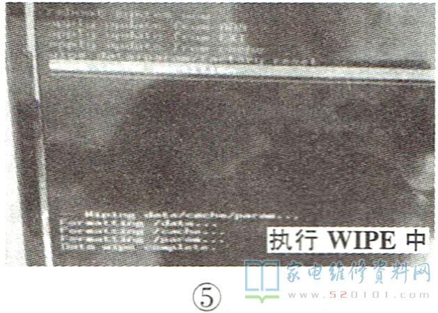 然后选择"wipe cache partition"项,按“信号源"键确认,如图5所示待擦除完成后,选择第一项"reboot system onw ,按“信号源”键确认,机器会自动重启,稍等片刻即可进入系统,如图6所示。