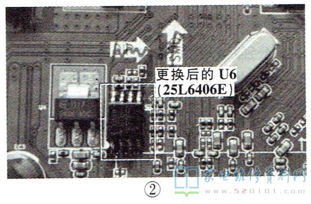 然后将U盘插在机器的USB端口中,按住本机面板.上的“菜单”键不松手,交流上电,屏幕会自动点亮,约3分钟后机器自动关机并重启,出现蓝屏。需要注意的是,如果屏上一直显示噪波点,且U盘的读写指示灯不闪烁,,则要换一一个U盘再次升级。故障现象2:指示灯亮,二次不开机。此故障原因多为U6物理损坏,需更换U6,如图2所示。