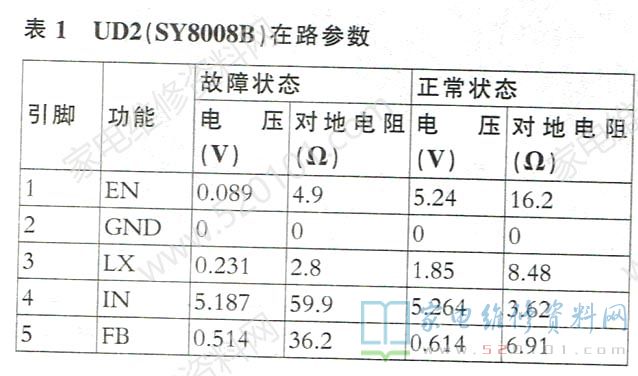 接修一台海尔LE32B3300W (TP.VST69D.PB83)型液晶彩电,上电后指示灯不亮,二次不开机。上电测得300V滤波电容EB1两端电压为310V,电源变压器次级输出的12V和40V(供背光)电压都正常,这说明开关电源正常。测试主板各路小信号电压,12V经过UD1形成的5VSB待机电压正常,但由UD2(SY8008B)变换输出的1.18V电压却为0.23V。断电,在路测试UD2的各脚对地电阻及电压数据见表1。很明显,UD2的①、③、④、⑤脚对地电阻过小,存在短路现象。断开UD2的③脚外接电感后,测试电感后端对地电阻正常,这说明UD2损坏,换新后故障排除。