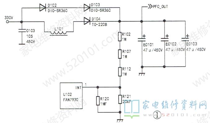 几天后故障复发,怀疑电源板上有热稳定性不良的元件。再次更换损坏元件,然后用万用表测试380V电压,同时用热风枪对PFC电路元件进行加热,当加热到PFC电压取样电阻R102、R107、R112时,PFC电压开始上升。断电,拆下这三只电阻测量,发现均有不同程度阻值变大现象,更换R102、R107、R112这三只电阻后故障排除。相关电路如图1所后来发现,PFC芯片U102( FAN7930 )性能不良也会出现此故障。因此,检修此类故障时最好将FAN7930一起更换,以免返修。