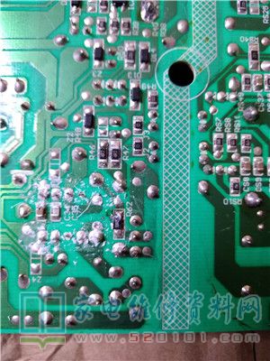 接修一台海尔电视LE42A300N液晶电视,故障表现为打开开关,电源指示蓝灯一直闪,该机电源板的板号是0094001855(图纸),开盖检查,5V电压在开机时只有2.6V左右,12V只有7V左右,24V只有17V左右,检查PFC电压380V左右,检查次级输出电容没有损坏,断开所有负载强制开机检查5V电压不够,只有4V左右,经查5V初级电路中,副供电回路中电阻R62开路10欧电阻,更换后正常。
