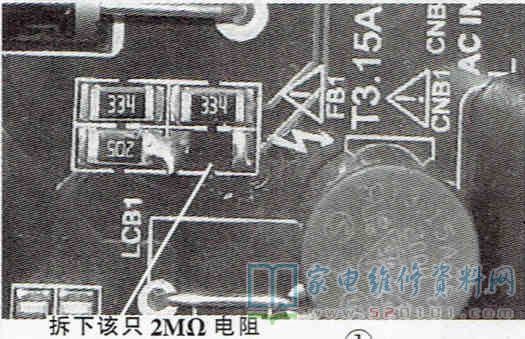 接修一台海尔LD32U3100型液晶彩电(采用三合一主板,板号:TP.VST69.PB901),三无。经查,电源IC和场效应开关管均已损坏。该机电源IC型号为LD5530,其引脚功能与LD7535基本致。换上LD7535及开关管后通电试机,没电压输出,且LD7535的⑤脚(vCC供电端)电压在9V~14V间波动,⑥脚无激励脉冲输出。断电后仔细检查,发现IC的③脚还串联有两只2MΩ上拉电阻,与交流电压相连,原来LD5530的③脚为过热保护检测端,而LD7535的③脚为开关频率设置端,通常对地接一只100k电阻。拆下一只2MΩ电阻,如图1所示。通电试机,输出电压正常,故障排除。