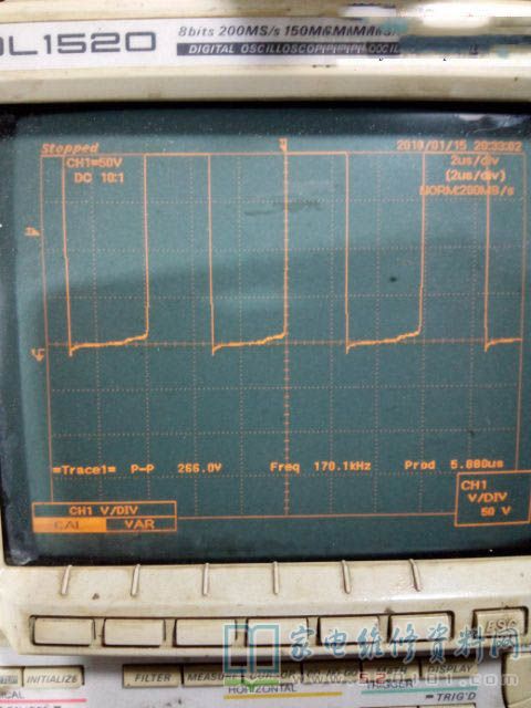 赶紧关机,可能负载有故障,测量发现果然后级肖特基sr5200击穿了一个,换后,再测量波形,很平稳。