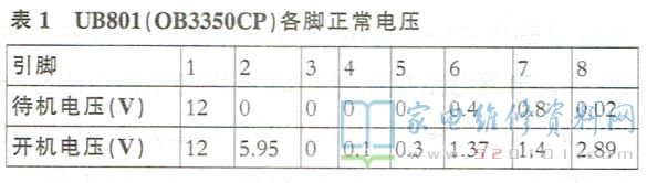检查升压二极管DB801、 开关管QB801均正常。上电测量驱动芯片UB801(OB3350CP)各脚电压,发现除①脚12V供电外,其他脚电压均为0V,故判断UB801损坏,换新后故障排除,此时测得UB801的各脚电压见表1,供参考。