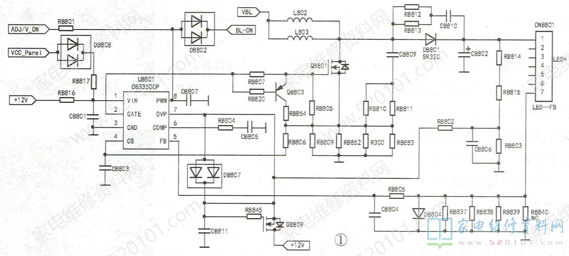 测得UB801 (OB3350CP) 的12V供电正常,插座CNB801的①脚(LED+ )电压约为90V。查询资料得知,本机LED背光工作电压在120V~147V之间,工作电流为280mA~320mA。判断该机升压电路没工作,造成VBL电压因空载而升至约90V。