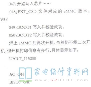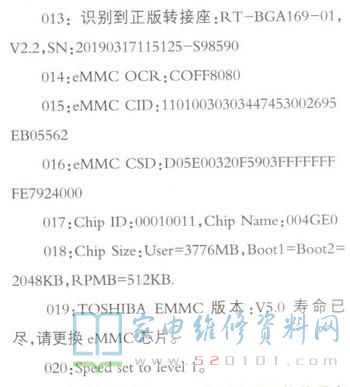 上述检测说明EMMC内部存储颗粒使用寿命已尽,已出现程序丢失现象。购回同型号eMMC,用编程器离线烧录对应的引导程序,其显示如下: