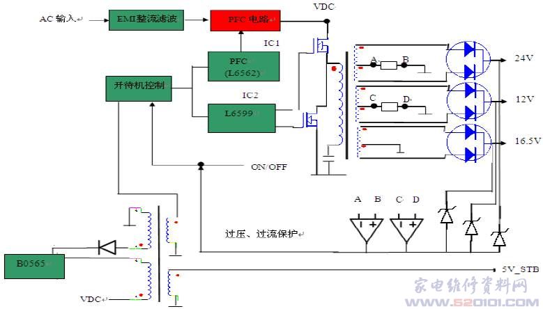 JSK4260-050由EMI输入、副电源电路、PFC功率因素补偿电路、主电源电路、开待机电路、保护电路6大部分组成。