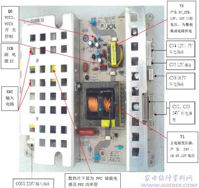JSK4260-050是海尔平板电视普遍采用的一款电源板,拥有24V、16.5V、12V、5V共四路输出,该电源板有以下特点:1)、高安全性;2)、保护齐全;3)、电路简单;4)、性价比高。