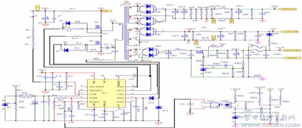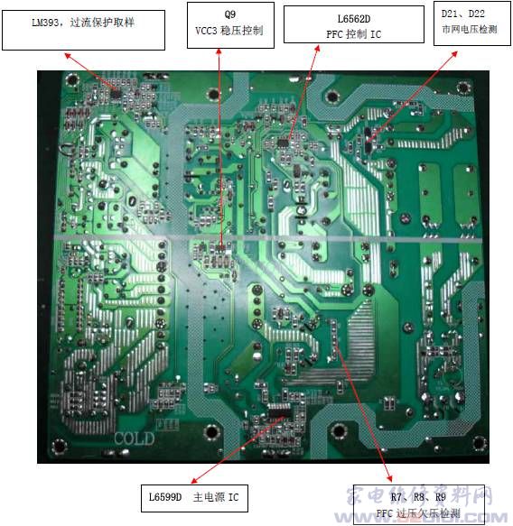 稳压过程:当PFC输出电压升高时,通过R17、R18、R19、R26分压得到的电压也会升高,此电压送到IC1的第1脚,在IC1内部进行比较,IC1第7脚输出的PWM信号占空比变窄,使Q1导通时间变短,L1A储能下降,最后使输出降低,PFC输出电压降低时过程与此相反; [Page]