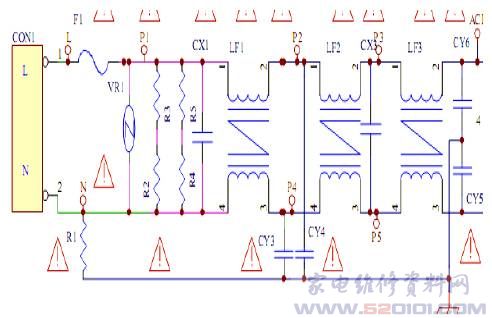 从结构上很容易看出,该电路实际是一低通滤波器,LF1、LF2、LF3为共模扼流线圈,它是绕在同一磁环上的三组独立的线圈,圈数相同,绕向相反,在磁环中产生的磁通相互抵消,磁芯不会饱和,主要抑制共模干扰,电感值越大对低频干扰滤除效果越好。增加这样的滤波电感对消除共模干扰的能力有很大提高。CY3、CY4、CY5、CY6为共模电容,主要抑制差模干扰,即火线和零线分别与地之间的干扰。电容值越大对低频干扰抑制效果越好,CX1、CX3为差模电容,主要抑制共模干扰,即抑制火线和零线之间的干扰。电容值越大对低频干扰抑制效果越好。R2、R3、R4、R5 对该电路中的电容起泄放作用,在关机后迅速泄放CX1、CX3中存储的电荷,防止带电损坏元件或对人造成电击伤害。