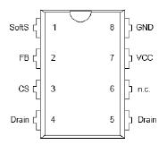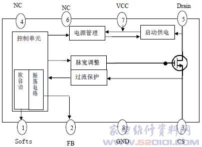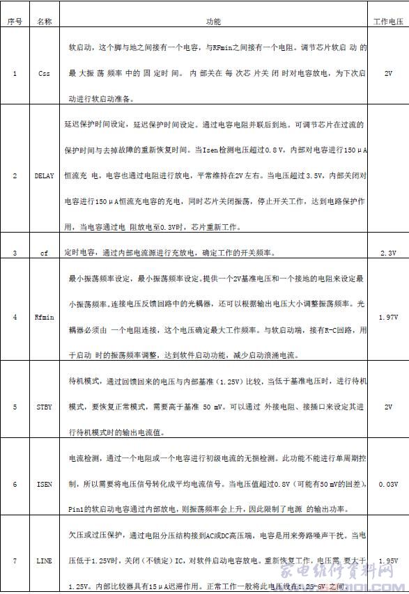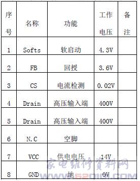 待机电路的核心器件为英飞凌公司生产的ICE3B0565,内部集成了自激振荡、稳压控制、保护电路、开关MOS管等器件,由于集成度比较高,外围所需原件很少,该集成电路引脚功能如下: