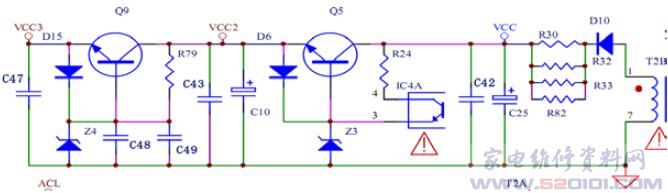 Vsb 开关变压器 T2B 绕组电压经 D10 整流,Q5、Z3 稳压后输出 Vcc2(14V 左右),供给 PFC 芯片   工作电压,并通过 Q9、Z4 稳压后输出 Vcc3  (12V 左右) 供给 L6599 第12 脚工作电压。过流、过压、ON/OFF 信号通过光耦 IC4 控制 Q5 的电压是否输出进而控制 PFC、LLC 电路是否工作来实现过压保护、过流保护、开关机功能。