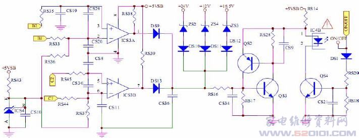 次级的过流延时电路在 L6599第一次检测到过流时,过流保护运放(ICS3)通过RS19和RS20检测到过流,运放输出对 CS36充电,同时通过 RS16和 RS17分压后给 CS34充电,由于 L6599第一次检测到过流时,2  脚 (Delay)设定的延时时间很短,电容 CS36、CS34上没有积累足够的能量,QS3不能导通,OCP保护电路没有启动。在 L6599 第2脚(Delay)从 3.5V通过 R54 放电到 0.3V 时,L6599重新工作,过流检测电路再次对CS36、CS34充电,此时电容上已经积累足够能量,QS3导通,QS2也导通,将光耦(IC4)内发光管供电拉到低电位, 使发光管无电流流过,光耦(IC4)光敏管电阻相当于无穷大,Q5因无基极偏压而无输出,关闭 L6599 的 VCC 电压,使主电路关闭,达到自锁保护目的。在测试时,有时会看到输出一闪,然后再保护,因为次级的 OCP电路要在 L6599 的 SCP电路第二次动作后才实现保护,所以次级的 OCP电路在保护时间上要滞后于 L6599的 SCP电路(大概相差 40mS 左 右,由其外接的延时电阻电容来决定具体时间),精确的过流点将由次级的 OCP电路来决定。  次级OVP(过压)保护电路结构相对简单,利用Z2、Z3、Z4三支稳压二极管分别监测24V、16.5V、12V,当其中任意一路输出电压升高时,相应的稳压二极管便会反向击穿,启动保护电路动作并锁死。