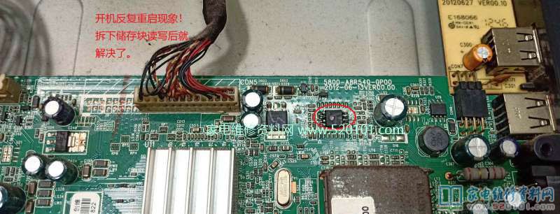 最近接修一台创维32E500E液晶电视,故障表现为开机后机器反复自动重启,拆开机器,测量机器各个电压均正常。怀疑是存储器数据丢失导致,于是拆开如下图红圈中所示的存储器,然后用RT809F工具读出数据,再把数据重新写回去。装上存储器后试机一切正常,故障修复。(家电维修资料网小编备注:如果您是非专业维修用户,可能手头上没有RT809F编程器,建议某宝上找一个商家,把主板寄过去代刷写数据,这样可以省去买编程器的费用)