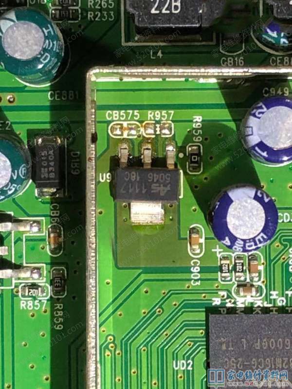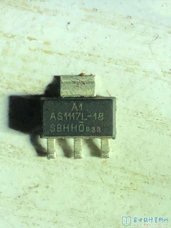 接修一台创维32K05HR液晶电视,故障表现为有时蓝灯不开机,拆开机器检测电源板5v正常,主板不送ON/OFF开机电压。这台机器主板型号是5800-A8K290-1000,其主芯片护板下,角落里有一块AS1117L-1.8,故障出现时,稳压块输出有时1.8V、有时1.5V、有时1.2V,找到旧的相同的主板上拆了一块同型号的稳压块进行更换,但是故障依旧,这是这台机器的通病,后来网购了一个1117-1.8C更换后,故障排除,试机一切正常。