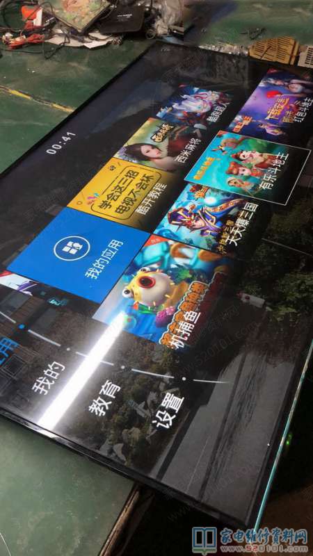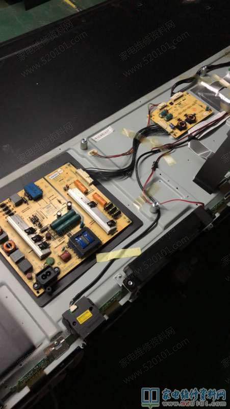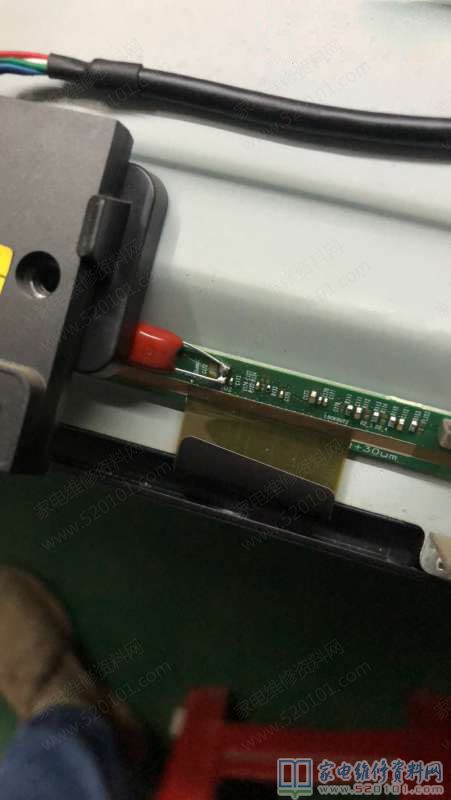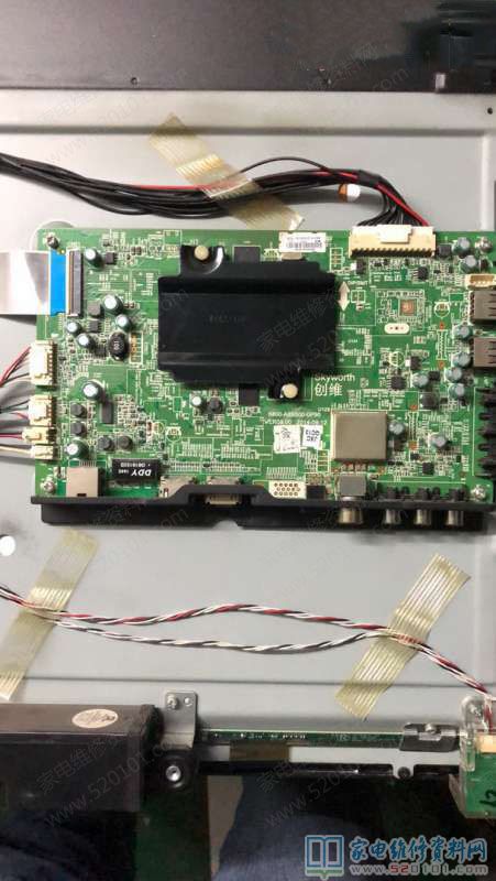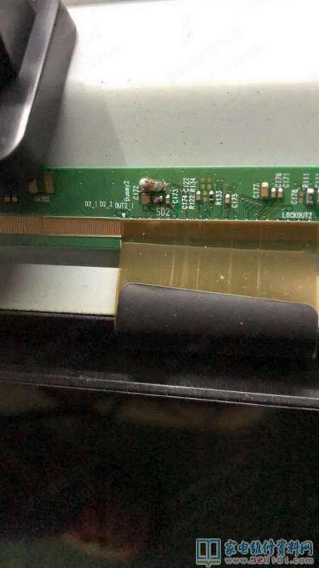 接修一台创维酷开55寸液晶电视,故障表现为开机有背光。拆壳检查电源供电正常,手摸芯片散热片有温度,怀疑问题在屏幕部分,量逻辑板上的测试点电压有一路VDD电压为零点几V,顺手摸电压产生IC烫手厉害,怀疑有负载过重现象,万用表测量该点对地电阻时为几欧姆,把屏排线断开后恢复高阻,问题压缩到了边板,当查到左二排线的供电滤波电容时发现已经短路,焊开后图象出现,故障得以解决。