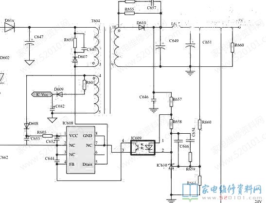 没办法只好代换电源IC光耦 431。但是还是一点用没有,又换回原件。看来故障应该还是在反馈,仔细检查原来是板标C670图纸是C646漏电,但图纸没有标容值不知道型号,试换了个103上去开机正常了 电压5.1V。