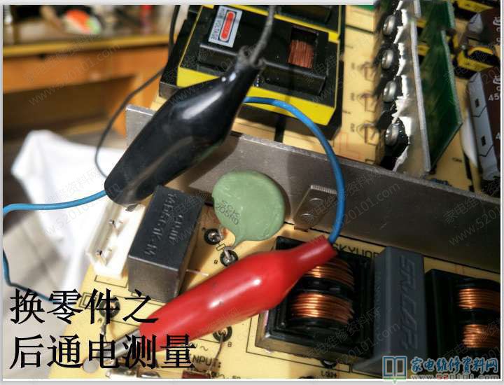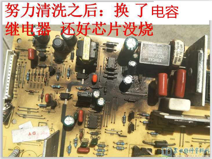 创维37M11HM液晶电视黑屏故障维修(图) 2021-06-25 20:05:33 阅读 494 次 评论 0 条 摘要: 接修一台创维37M11HM液晶电视,故障表现为黑屏,以下图文内容为整个维修过程,分享给大家维修参考。 机器内部全貌 后盖都黑了 接修一台创维37M11HM液晶电视,故障表现为黑屏,以下图文内容为整个维修过程,分享给大家维修参考。 机器内部全貌 后盖都黑了 电源部分烧了 努力清洗之后换了电容、继电器,还好芯片没有烧 烧毁的零件如下图所示 换零件之后通电测量 短接处如下图所示 维修完成 版权声明:本文为转载文章,版权归原作者所有,欢迎分享本文,转载请保留出处! 点赞 分享: PREVIOUS:创维32E500E液晶电视指示灯亮但偶尔无法开机 NEXT:创维42E5CHR液晶电视花屏的故障检修 文章导航