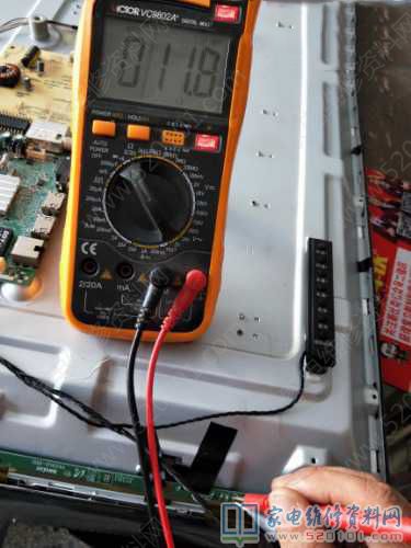 用万用表测量贴片电容,发现有一组只有11欧左右,看网上好像可以用“烧机”法,但我用最笨方法,拆一个量一下,终于拆到CD19测量正常,将之前的装上,再在其他板拆个焊上,电视重新焕发青春光彩,故障修复。
