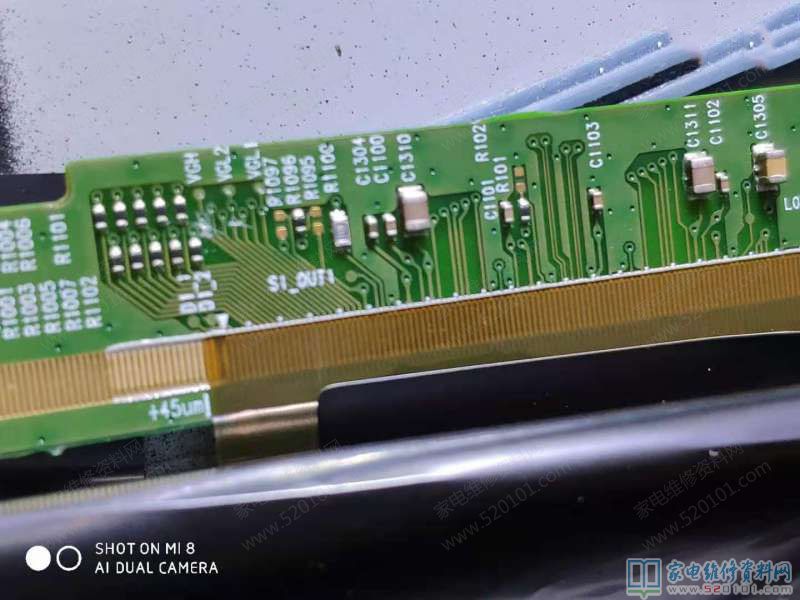 然后又在另外一个网站上说是撕掉边板左边最左边COF排线,感觉看他的修复结果确实满意多了,不过撕掉COF感觉风险有点大,于是还是用自己的经验结合理论分析,我估计还是左边Y轴COF有轻微短路(这种短路出现双影横线干扰,机理有待高人解释),于是想切断Y轴门电压进行修复,当我割断图片第一根VGH28V后电视机好了,后来害怕VGL搞破坏,也把它一起断掉,这就是我分析的VGH和VGL并排走线的弊端,后来发现图像左边上面有轻微黑横道,估计是那个地方的Y轴COF有问题,由于我已割断电源估计问题不会再严重了,这是一个LG屏幕,Y轴有无外接COF不太清楚?我估计应该又是玻璃屏幕。