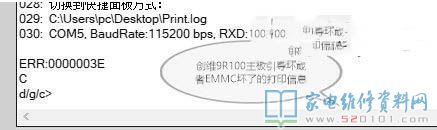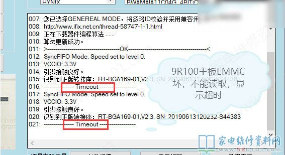 只有一行,还报错了,从此信息可以看出是引导坏,此机芯没有外挂引导,不多说了,直接拆EMMC,然后放座子上检测读取,还提示超时了。