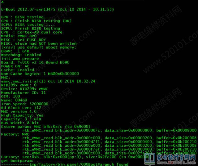 接修一台创维40E690U液晶电视,这台电视采用的机芯是9R10,故障绿灯亮不开机,是一台同行维修部送来的,拿来时候说主板供电全部正常,说可能数据问题,于是我再次拆机检测主板核心供电确实是正常的,用编程器链接串口看打印信息,如下图所示。
