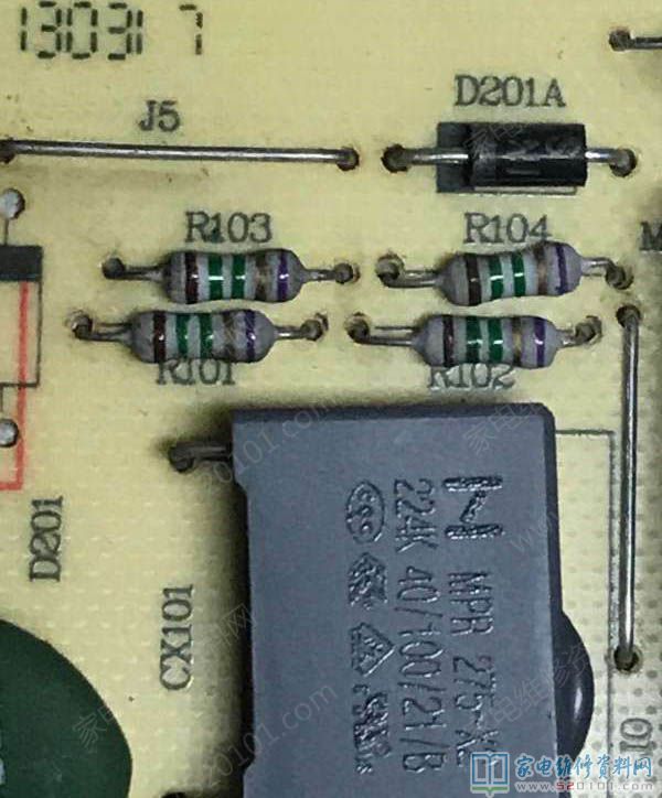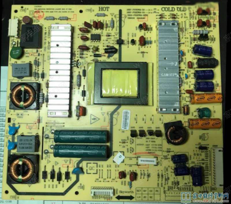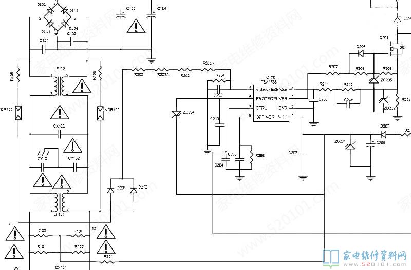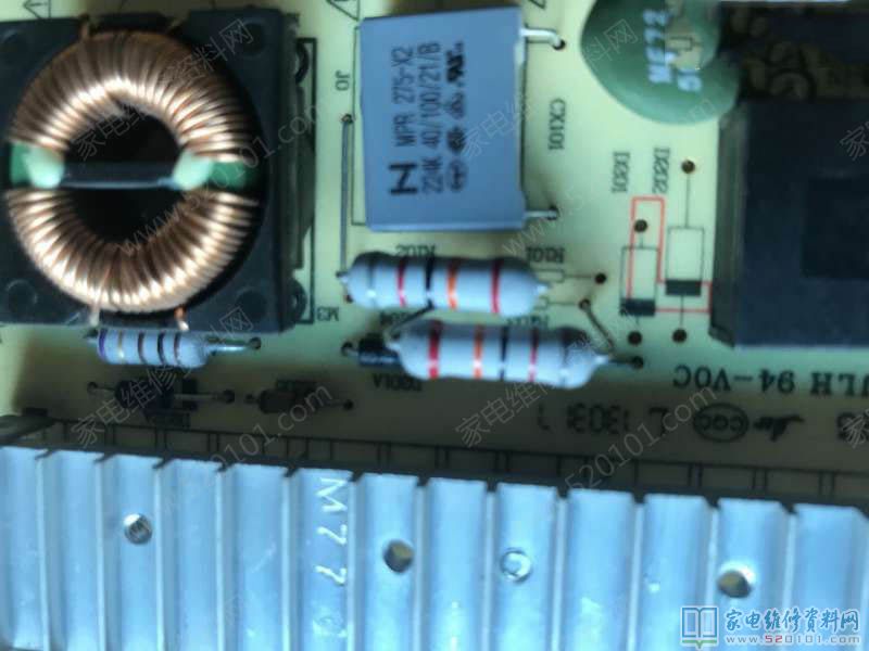 接修一台32寸的创维32E600Y液晶电视,故障表现为通电三无,电源灯也不亮,开机没有5V待机输出,板号是168P-P37EXM-02、168P-P32EXM-04,(5800-P32EXM-0P50),检查电源板大电容有330V,没有5V电压,首先习惯性的先检查IC100(TEA1733P)各脚数据,查到IC100的一脚没有启动电压,顺着这条线路查,R101、R102、R103、R104,这四个电阻应该是1.55M欧/1/2W的,在线测量都变成无穷大了,因为这四电阻是两两并联的,相当与是两个775K的电阻串起来的,为了保证使用寿命,现在用2个820K/2W的电阻替换。通电试机电视机恢复正常。这种故障是这款板的通病,由于电阻功率太小,加之长时间使用,电阻就会发热变质造成开路,以前也修过创维同类故障主板几个,也是这几个启动电阻开路坏掉的。