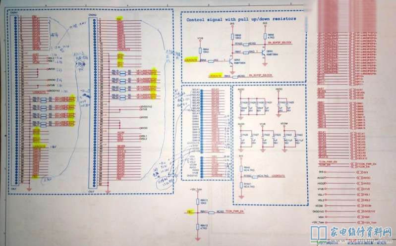 找了一份电路原理图,测试不正常时的电压,发现“VGH”等关键电压倒是一直是正常的,而“GCLK”、“GVST”、“GODD”、“GEVEN”一致恒定在与“VGH”一样的高电压(36.65V)。不像其它的案例中的没有“VGH”、“VGL”等。