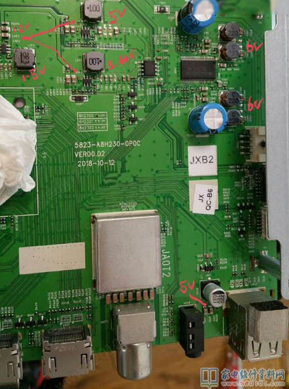 接修一台创维55G20液晶电视,故障表现为受潮后开机满屏灰色竖线,但有时能正常显示,天气干燥后又能正常,不好确定此故障原因,首先从基础做起,测量一遍各电路电压值,如下图所示。