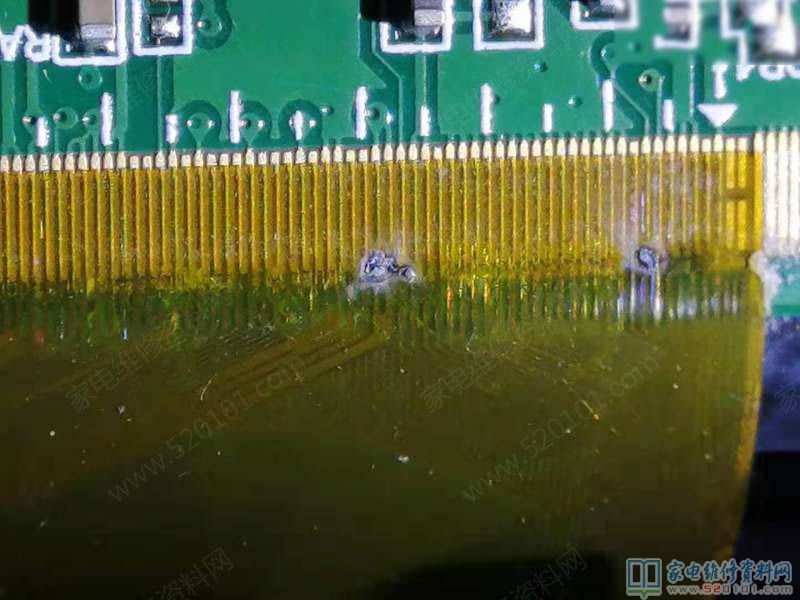对屏接口、PCB做过清洁、干燥;对左半部分第一个COF与PCB接口用烙铁加铁氟龙热压后,似乎故障消失。但还有个问题,就是这有问题的左半屏存在略微的频闪,像是工频(确定不是背光引起)。