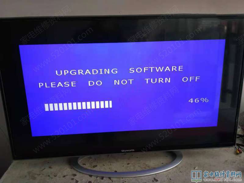 接修一台创维42E660C液晶电视,故障表现为卡在正在启动界面上,解决办法是将电视关机,然后将MstarUpgrade.bin(刷机数据包可以在某宝花几元钱购买或者在本网搜索下载)放入空白的U盘里,插到电视UBS插口,按住电视本机按键的“音量-”通电开机,开机后8秒放开“音量-”键,系统将自动升级主程序 (升级的时候屏幕会显示蓝屏进度条)升级好后第一次开机是雪花状态,切到视频,声图正常,故障修复。